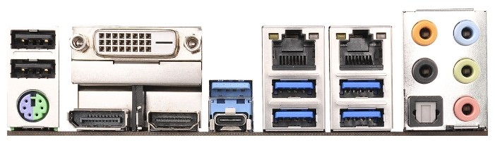 Интерфейсы: 18 USB, из них 8 USB 3.0 (4 на задней панели), 2 USB 3.1 (2 на задней панели), выход S/PDIF, 1xCOM, DVI, HDMI, Ethernet