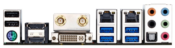 Интерфейсы: 10 USB, из них 6 USB 3.0 (4 на задней панели), выход S/PDIF, 1xCOM, DVI, HDMI, 2xEthernet