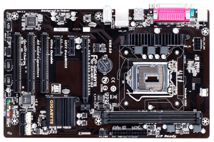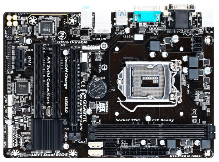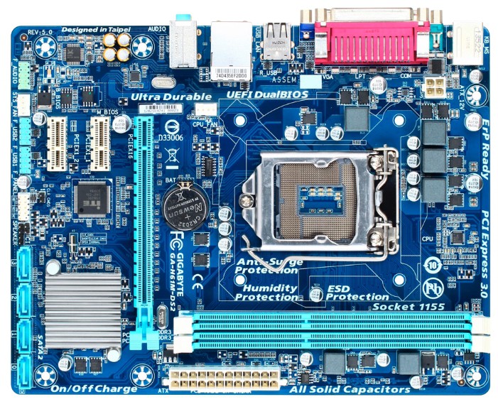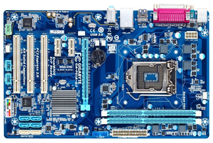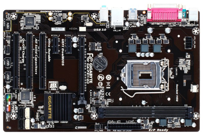 1xPCI-E x16, 2xPCI-E x1, 3xPCI, 8 USB, выход S/PDIF, 1xCOM, D-Sub, Ethernet, LPT